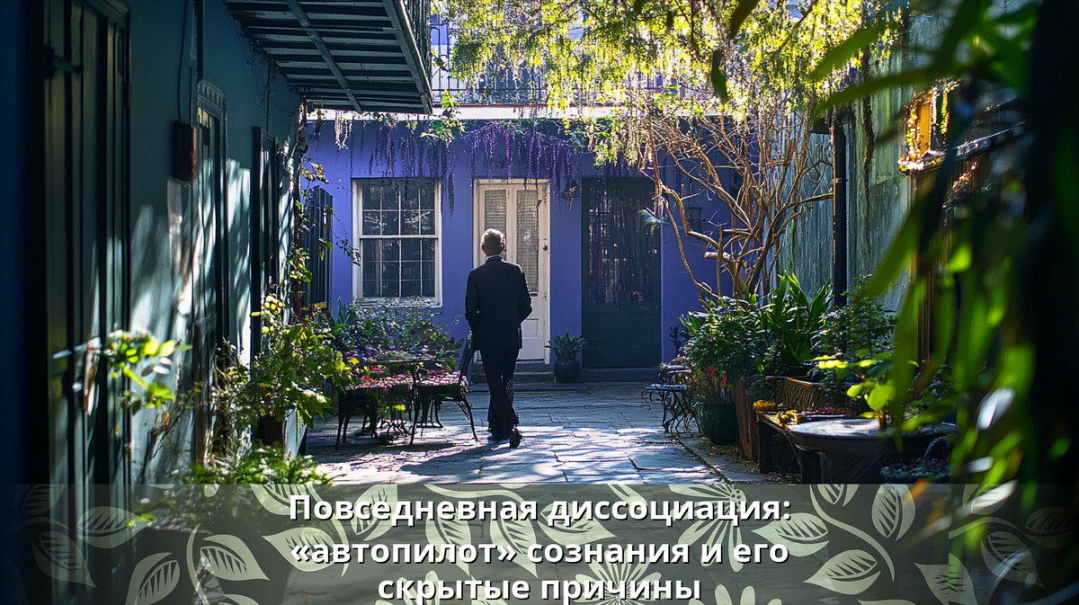 Повседневная диссоциация — это когда мы живём, но не полностью осознаём свою жизнь. Часто мы действуем на автомате, не задумываясь о том, что происходит внутри нас. Мы принимаем решения, выполняем обязательства, общаемся с людьми, но при этом теряем связь с нашими настоящими желаниями и потребностями. Это приводит к внутреннему разобщению, ощущению, что мы не живем своей жизнью, а лишь выполняем действия, продиктованные внешними обстоятельствами.