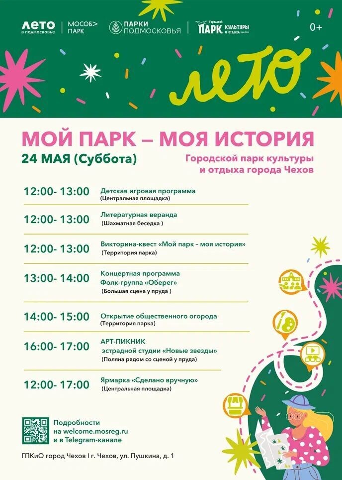 ✨ МОЙ ПАРК - МОЯ ИСТОРИЯ - фестиваль в парке 🌞 🔹12:00 - 13:00 Детская игровая программа (центральная площадка) 🔹12:00 - 13:00 Литературная веранда (шахматная беседка) 🔹12:00 - 13:00 Викторина-квест "Мой парк - моя история" (территория парка) 🔹13:00 - 14:00 Концертная программа. Фолк-группа "Оберег(большая сцена у пруда) 🔹14:00 - 15:00 Открытие общественного огорода (территория парка) 🔹16:00 - 17:00 АРТ-ПИКНИК эстрадной студии (поляна рядом со сценой у пруда) 🔹12:00 - 17:00 Ярмарка (центральная площадка) 🚫 Возраст: 0+ 📆 24.05.2025 🕛 12:00 🏢 Городской парк культуры и отдыха 📍 г. Чехов, ул. Пушкина, д.1 🪙 Вход свободный❗️ #webЧехов ✅ Мероприятия Чехов https://dzen.ru/id/66cc4b48e9ef144699238a51 http://vk.com/chekhov_events http://dzen.ru/chekhov_events