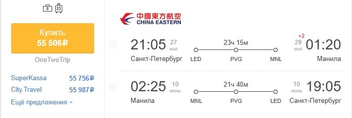 ✈️Санкт-Петербург - Манила (Филиппины), пересадка в Шанхае, с багажом за 55500 рублей