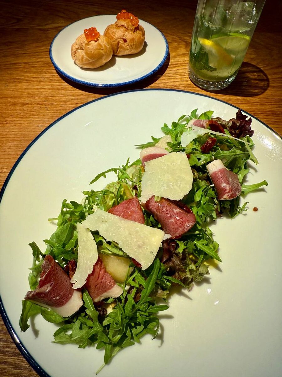 🔹 Брала салат с уткой и запечённым яблоком, профитроли с красной икрой и лимонад с мятой, за всё 1640р. Салат замечательный, а вот икры стоило бы положить побольше.