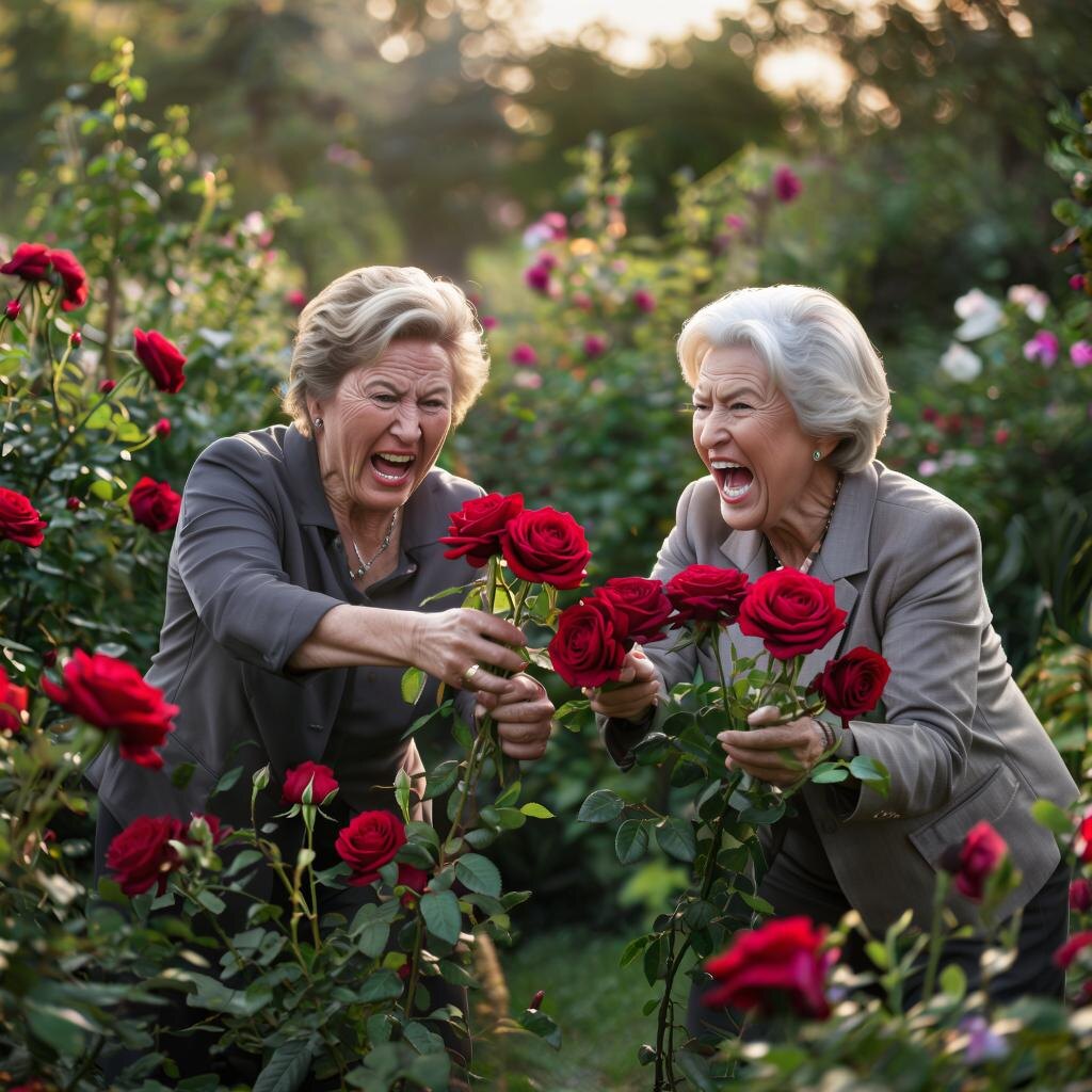 Стремление избежать повторного переживания негативных эмоций побуждает меня изложить произошедшую ситуацию лаконично. Началось всё ранним утром — около восьми часов. Прогулка с собакой вывела меня с аллеи к нашему дому, рядом с которым растут несколько ухоженных кустов роз. Эти растения были посажены и выращены моей подругой, проявившей инициативу и заботу. Она холила розы, защищала их от холода зимой, ухаживала летом, проводя обработку от вредителей и своевременную обрезку. Результат её усилий впечатляет: великолепные розы распустились почти полностью, радуя глаз своей красотой. Однако идиллическая картина была нарушена появлением двух пожилых пенсионерок, которым они тоже "радовали глаз".. Вооружившись садовыми ножницами (секаторами), они уверенно направились к одному из кустов и начали методично срезать нераскрывшиеся бутоны. Увидев это, я попыталась остановить их, задав очевидный вопрос:
