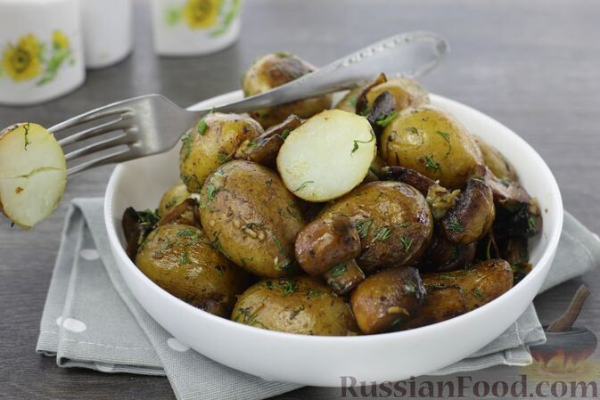 Жареная отварная молодая картошка с грибами и мёдом – простое ароматное блюдо и на каждый день, и к празднику. Отварной картофель обжаривается с мёдом, что придаёт блюду особый вкус, затем соединяется с обжаренными шампиньонами, чесноком и свежим укропом.