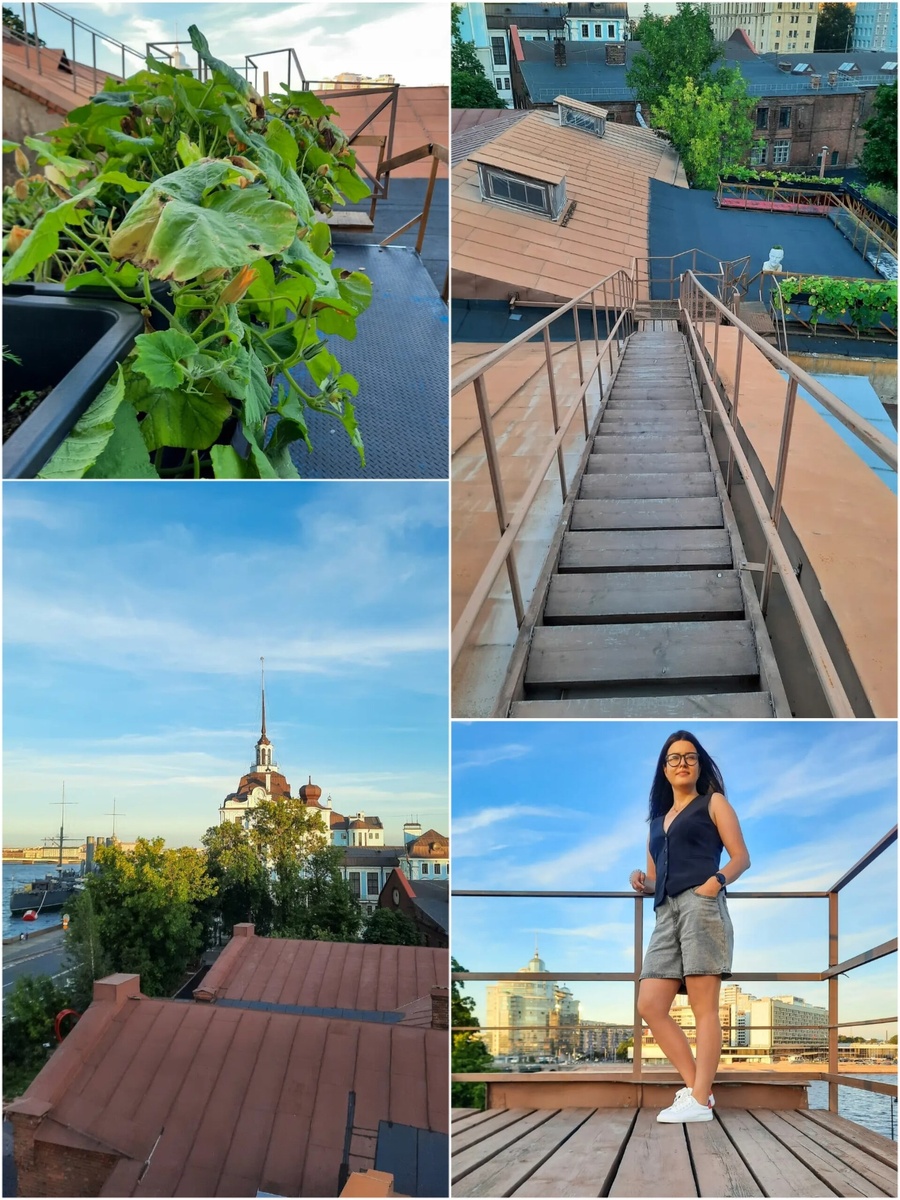 Пройдя через мастерскую, можно попасть на живописную смотровую площадку на крыше, откуда открывается вид на Неву, здание Нахимовского училища и крейсер «Аврора». Интересной особенностью площадки является настоящий огород с капустой и зеленью.