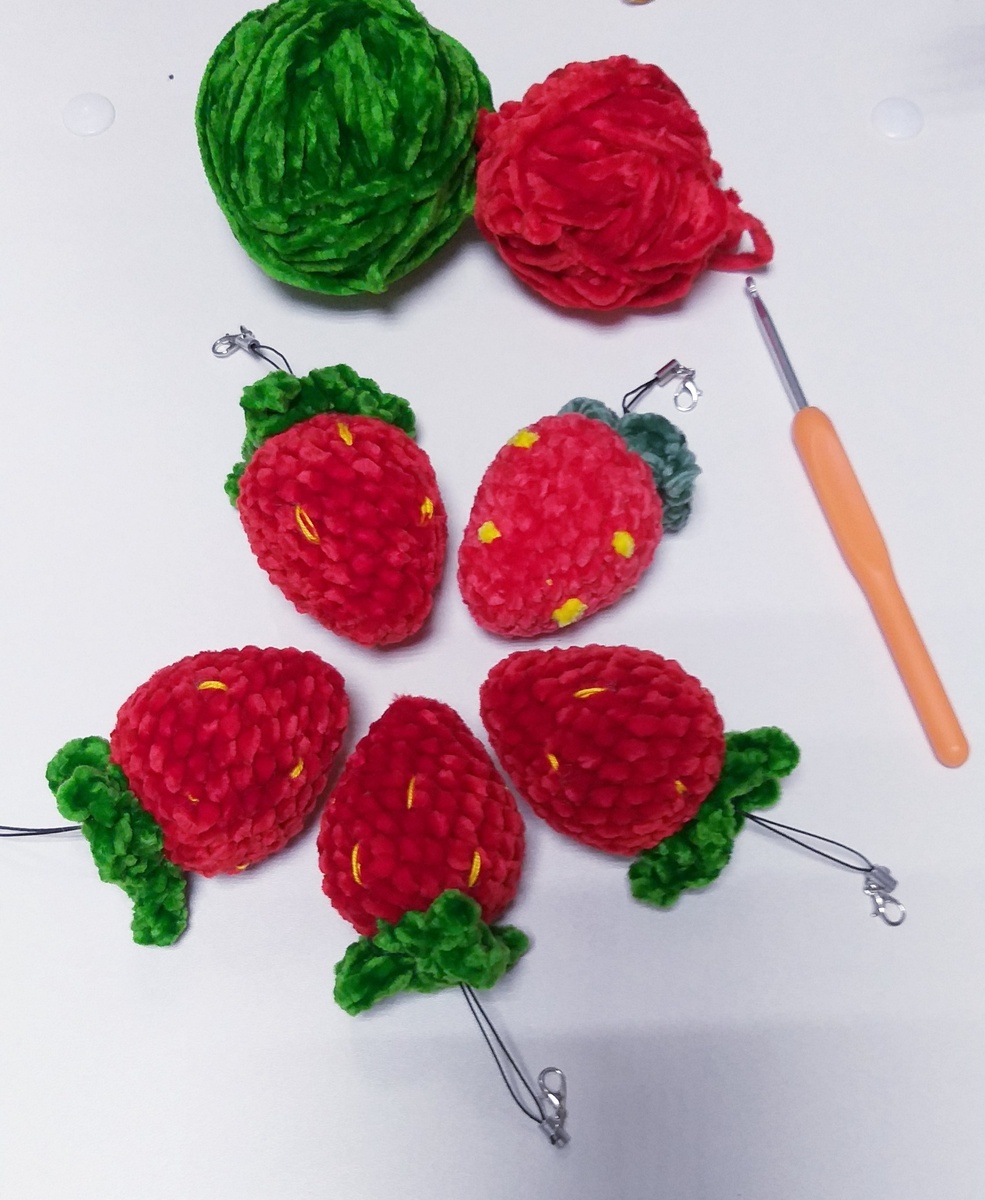 Крючок 3.5 см. Пряжа велюр 100гр/160м зеленая, красная; нить Ирис желтого цвета для зернышек, основа для брелка.