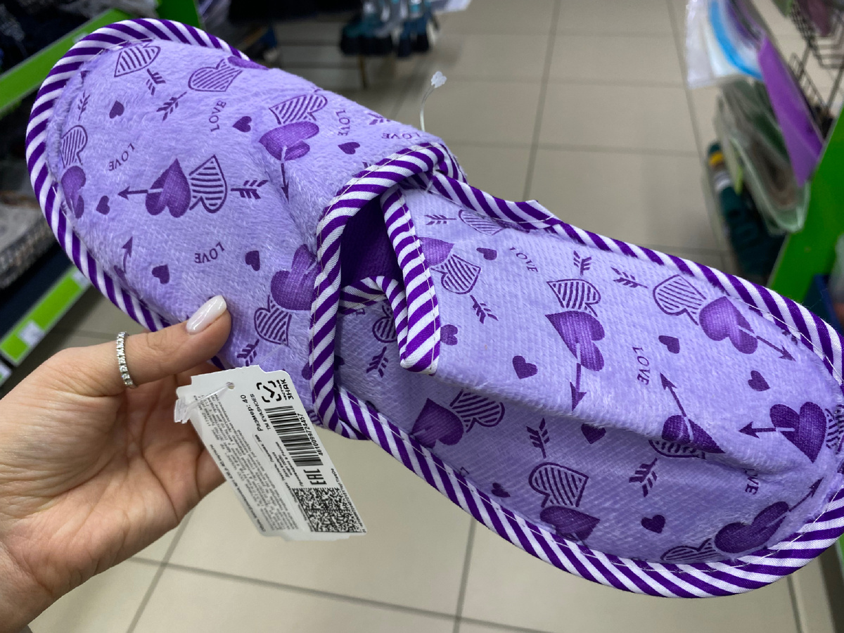 Тапочки также имеют несколько размеров, изготовлены из полиэстера и ЭВА. Сделаны в России. Цена 399 рублей.