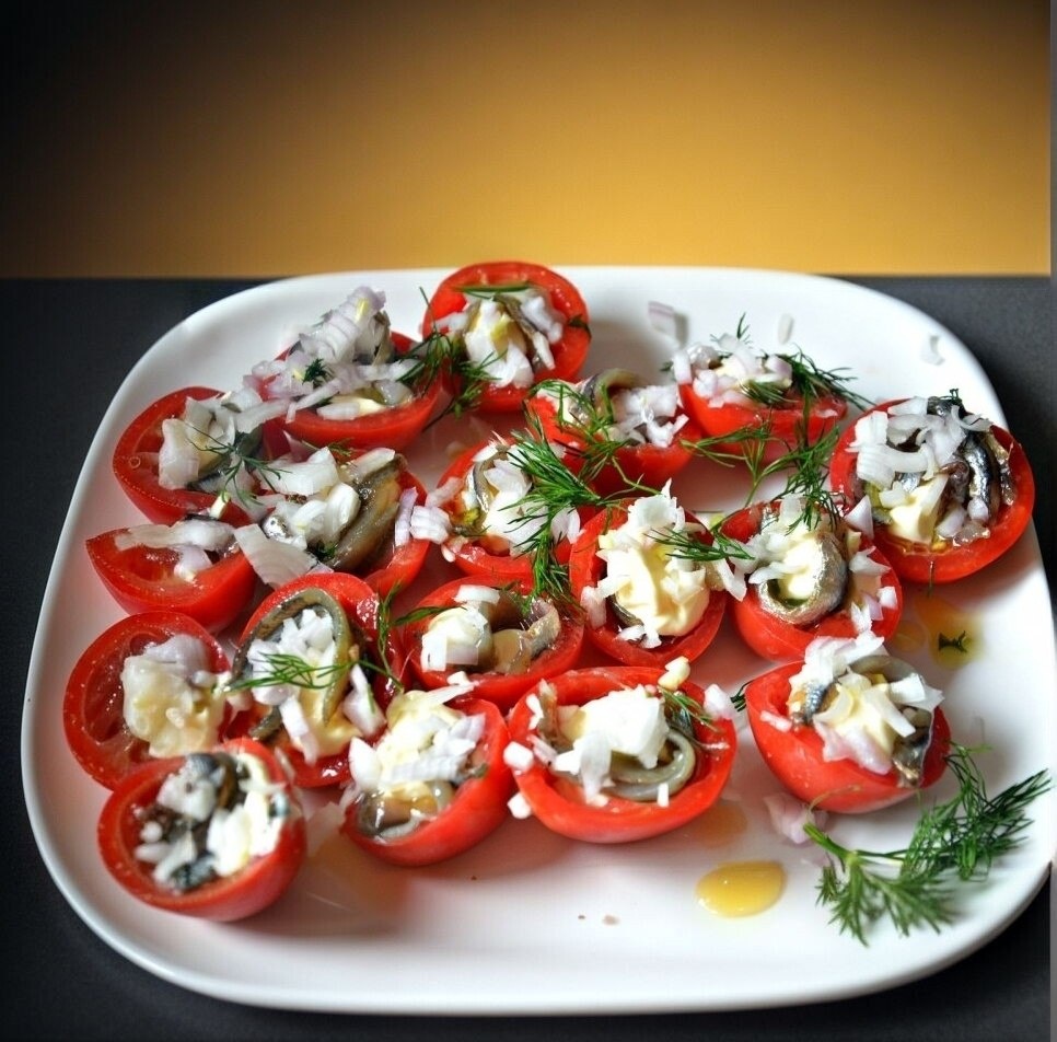 Эта простая, но эффектная закуска сочетает кисло-сладкие помидоры, солёную кильку и пряный маринад. Отлично подходит к картошке, чёрному хлебу или как дополнение к крепким напиткам.