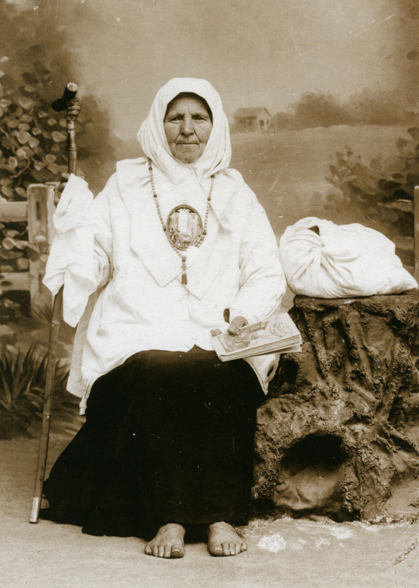 Фотография мастерской Карла Буллы. Петербургский бытописатель А.А.Бахтиаров, автор известной книги «Брюхо Петербурга», описывая свою встречу с Матроной на освящении Скорбященской часовни 20 декабря 1909 года, отмечал: «Сквозь толпу пробиралась вперед какая-то женщина, вся в белом и босая. Она с таким усердием молилась перед алтарем, делая земные поклоны, что нисколько не шокировала религиозные чувства богомольцев – в своем странном одеянии…. Я заинтересовался босоножкой, т.к. слышал, что это – местная юродивая и в самые жестокие морозы ходит босой. И стал наблюдать за ней, как за человеком не от мира сего, как отголоском древней благочестивой старины, которая изобиловала «юродствующими во Христе». Подобно Василию Блаженному, предсказавшему пожар Москвы, Прокопию Устюжскому, предсказавшему каменный дождь в Великом Устюге, и Ксении Блаженной, предсказавшей в свое время смерть императрицы, Матрона Босоножка тоже обладала даром предсказывания».