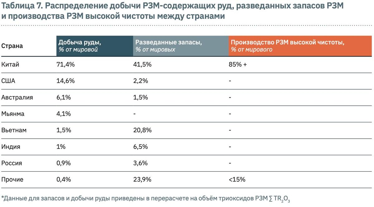 Россия обладает значительными запасами РЗМ, занимая четвертое место в мире. При этом годовая потребность российской экономики в РЗМ составляет около 1,4 тыс. тонн, на текущий момент это потребление более чем на 90% обеспечено импортом.