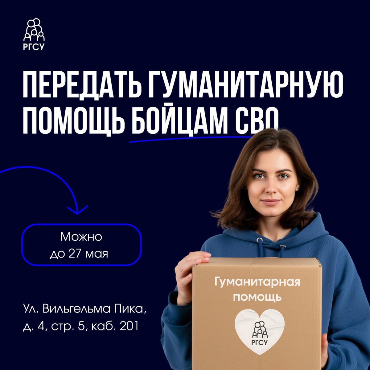 Сотрудники Университета организовали сбор помощи для бойцов СВО. Можно принести новые товары в упаковке или с бирками: → каталитические грелки, → окопные свечи, → тактические фонари, → аптечки и медицинские товары, → средства личной гигиены и другие необходимые вещи. Более полный перечень со ссылками для вашего удобства здесь. Все необходимое приносите до 27 мая в Волонтерский центр РГСУ по адресу: ул. Вильгельма Пика, д. 4, стр. 5, каб. 201. График работы: → понедельник — четверг: 09:00–18:00, → пятница: 09:00–16:45.