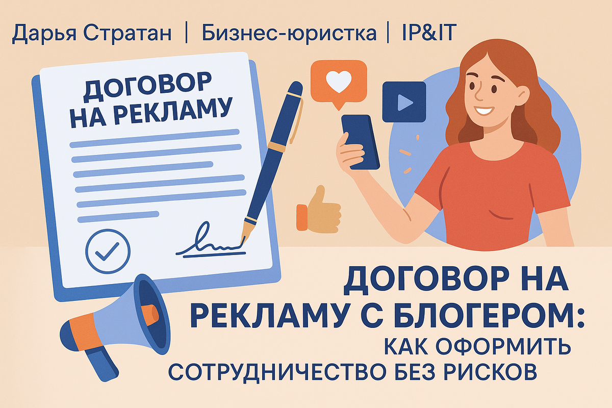 Приём-приём! На связи Дарья Стратан — эксперт в области правового сопровождения бизнеса и защиты интеллектуальной собственности (IP&IT). С 2021 года я веду частную юридическую практику и сопровождаю онлайн-проекты на всех этапах — от идеи до масштабирования. В частности, я оформляю договоры на оказание рекламных услуг для блогеров и рекламодателей, для которых и предназначена эта статья. Договор на оказание рекламных услуг — это ваш основной инструмент правовой защиты от штрафов, судебных разбирательств и претензий контролирующих органов. Фактически, это соглашение между блогером и рекламодателем, которое регламентирует весь процесс сотрудничества. В договоре важно зафиксировать следующие ключевые моменты: Чётко пропишите предмет договора — это позволит избежать требования "дополнительных правок" без дополнительной оплаты. Если рекламодатель хочет использовать рекламные материалы вне аккаунта блогера, то следует предусмотреть вознаграждение за передачу исключительных прав на контент
