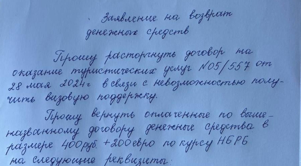 В течение нескольких месяцев нас кормили обещаниями, что виза «вот-вот будет», но в июле стало ясно: документы никто не подавал. Задержку нам объясняли различными причинами. Сначала директор ссылался на общую сложную ситуацию с получением виз, затем — на неэффективную работу посредника, через которого якобы осуществлялась запись в визовый центр. Позже добавились личные обстоятельства — он утверждал, что был занят решением семейных вопросов и не мог своевременно заняться ситуацией.