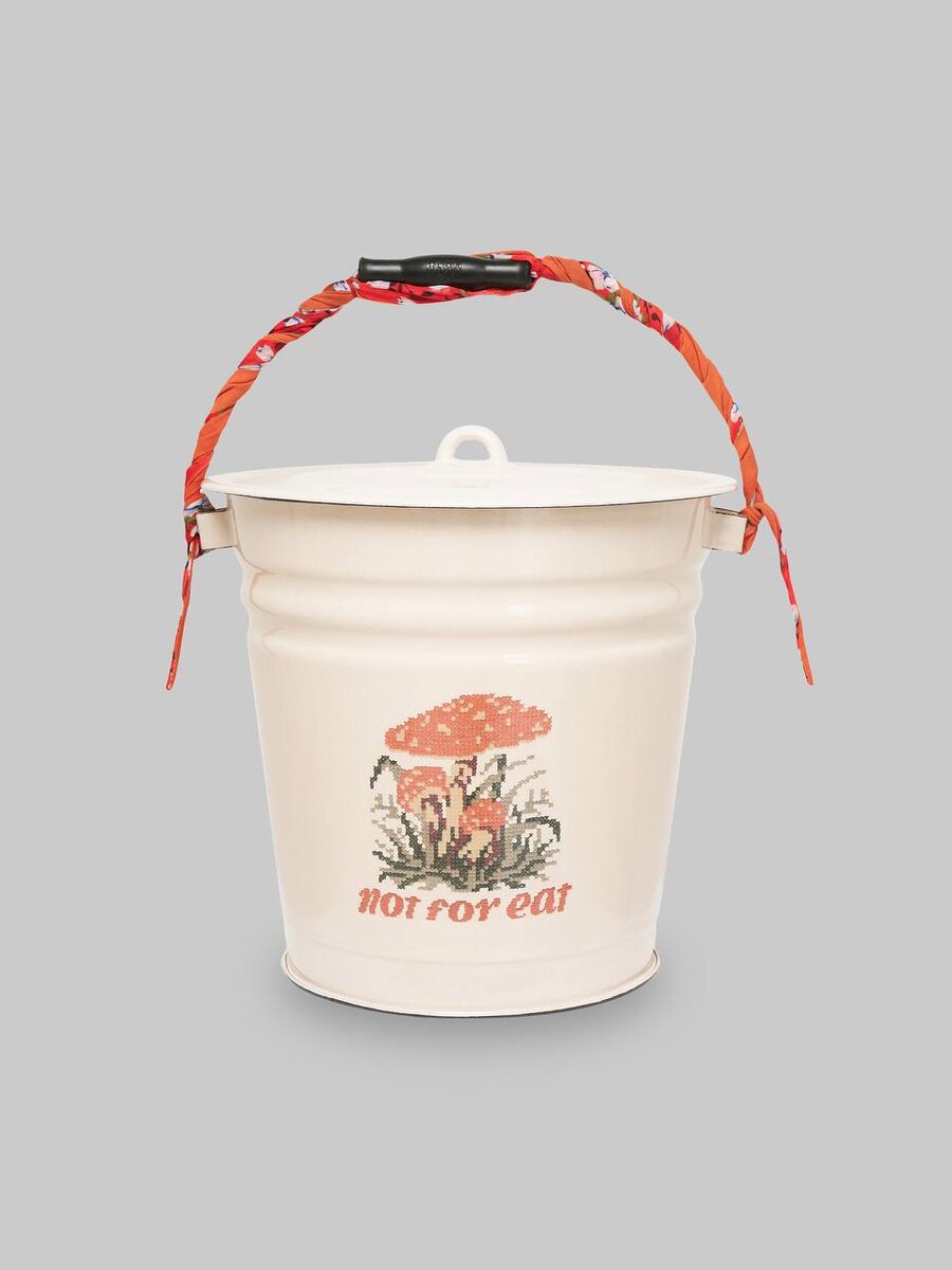 Ведро из коллаборации RomaUvarovDesign x ODOR изготовлено из высококачественной стали с эмалированным покрытием и принтом вышивки с грибом