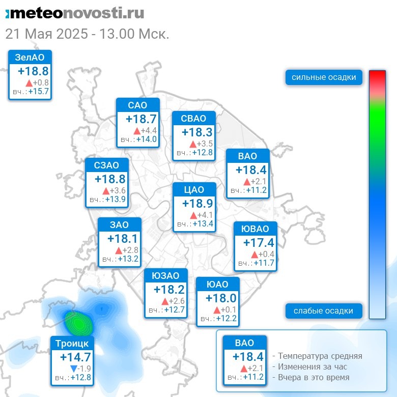 В 13:00 в Москве было от +15.9°C до +20.6°C, средняя температура +18.4°C #погода #Москва #весна #температура #21мая #среда