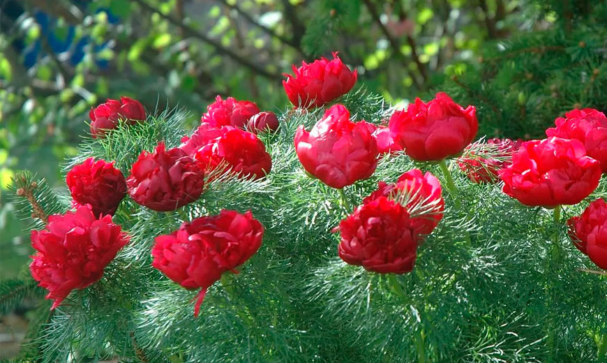 Цветы пиона узколистного поражают своей насыщенной окраской — это одиночные ярко-красные чашевидные бутоны диаметром 5-15 см с 8-10 глянцевыми лепестками. В центре цветка расположены многочисленные золотистые тычинки, создающие эффектный контраст с алыми лепестками. Есть сорта с цветками алого или нежно-розового цвета. И даже белого молочного. Эффектны и махровые сорта пиона тонколистного.