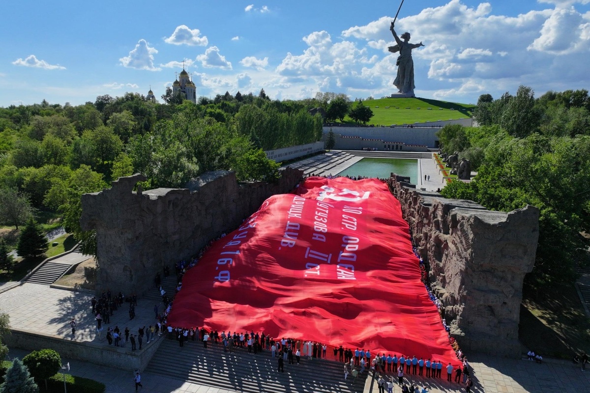 Волгоград принял участников Всероссийской патриотической экспедиции «Непокорённые», которая проходит в городах-героях России и Беларуси. ✔️В акции приняли участие более 700 человек - активисты МГЕР, студенты волгоградских вузов, представители общественных организаций и патриотических объединений. Самую большую копию Знамени Победы участники акции развернули между стенами-руинами. Его длина составила 65 метров, а ширина – 35 метров. На главной высоте России участников акции поприветствовал врио замгубернатора Волгоградской области Михаил Битюцкий. 💬«Наш регион — место решающих боев во время Великой Отечественной войны, которые и определили ход мировой истории, поэтому мы по праву называемся Родиной Победы. А герои этой Победы — воины Красной армии со всех уголков нашей необъятной Родины. Благодаря этому многонациональному единству нашего народа мы победили фашизм. Сегодня крайне важно об этом помнить. В рамках содружества Союзных государств важно хранить общую историческую пам