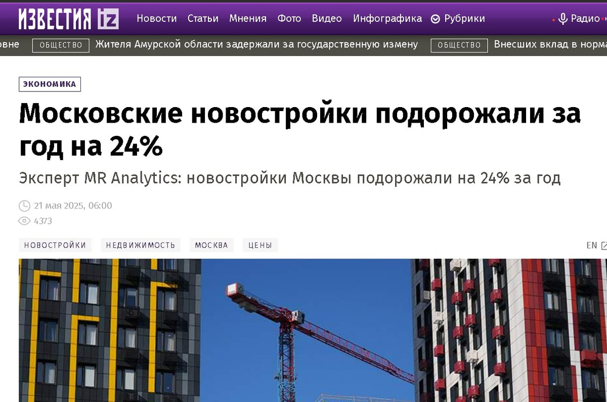 Подзаголовок: Эксперт MR Analytics: новостройки Москвы подорожали на 24% за год