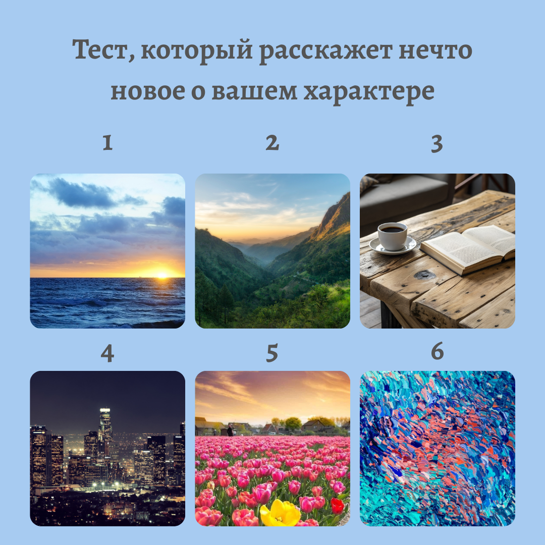 Выберите одну картинку, которая привлекает больше всего. Читайте результат ниже 👇 1. Закат над океаном Вы - романтик с глубоким внутренним миром. Любите мечтать, цените моменты уединения и искренние разговоры. Часто интуиция подсказывает правильный путь. 2. Горы и восход солнца Вы - человек цели и преодоления. В вас много силы и решимости.Не боитесь трудностей, умеете ставить амбициозные задачи и идти к ним шаг за шагом. 3. Книга и кофе Вы - душа уюта и созерцания. Цените спокойствие, глубину и атмосферу. Любите все продумывать, анализировать. Предпочитаете настоящую близость шумным вечеринкам. 4. Город ночью с огнями Вы - искатель впечатлений. Любите драйв, новые знакомства и чувствуете себя как дома в центре событий. Жизнь - приключение, и вы не хотите его упустить. 5. Цветущее поле Вы - гармоничный и добрый человек. Часто заботитесь о других, умеете радоваться простым вещам. Вы мягкий, но внутренне устойчивый человек, которому доверяют. 6. Абстрактная картина в ярких цветах Вы - кр
