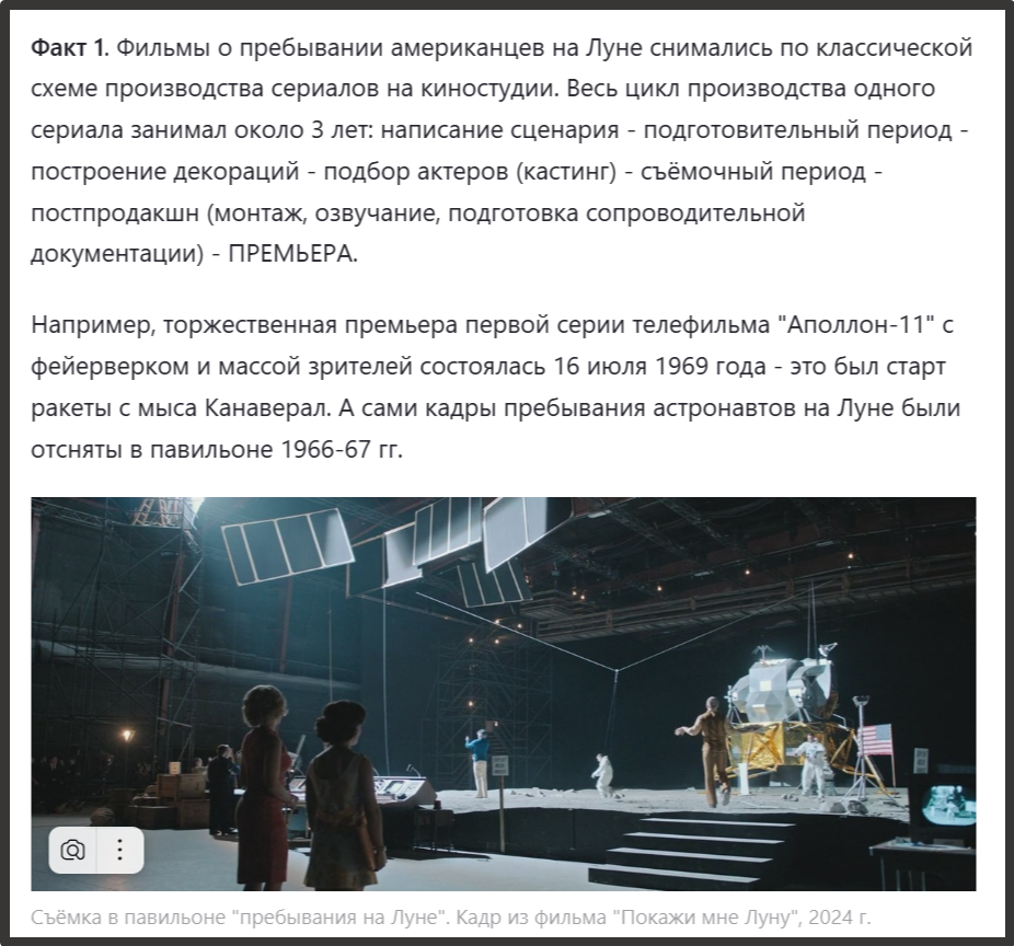 Аргумент автора о том, что полёты на Луну снимались в студии по схеме производства сериалов, не выдерживает критики. Он основан на предположениях, не подкреплённых фактами, и противоречит реальной хронологии программы «Аполлон» и технологическим возможностям 1960-х годов. Отсутствие доказательств и публичный характер программы делают эту теорию маловероятной.