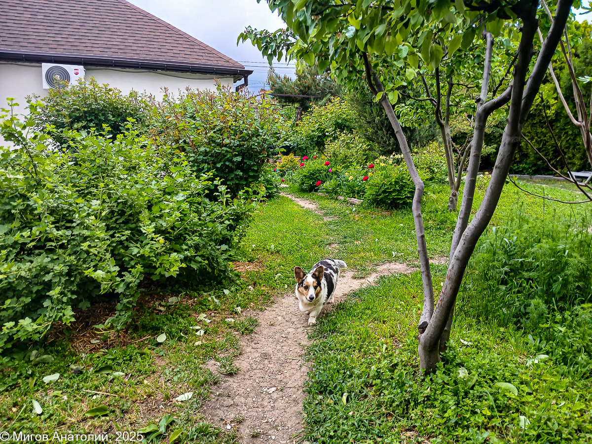 Поэтому терпеливо и молча ждет. А потом преданно топает по дорожкам сада впереди меня или за мною следом.