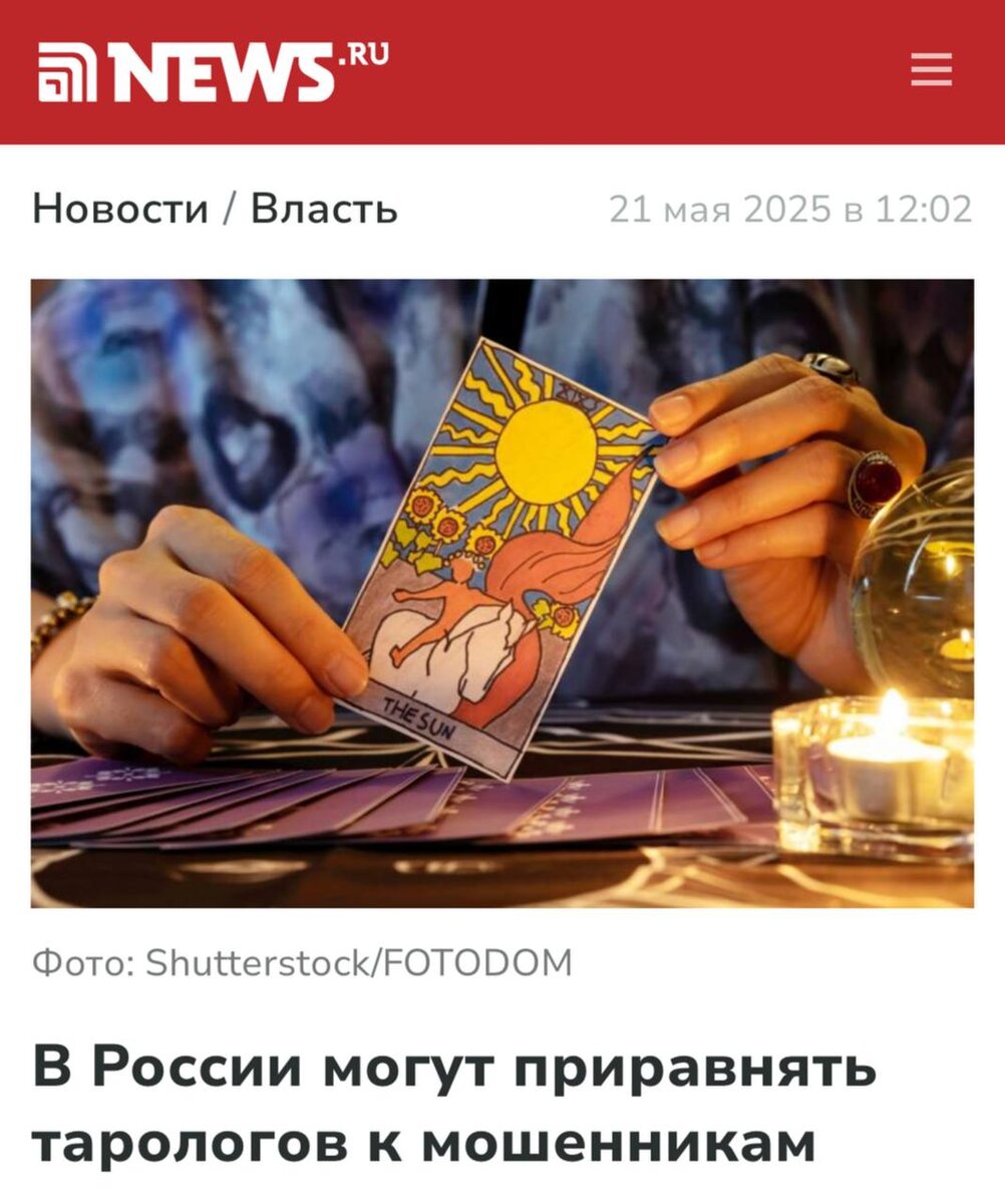 Тарологов могут ЗАПРЕТИТЬ — в Госдуме готовят законопроект, который приравняет их к мошенникам. Депутат Милонов считает, что карты Таро — это диверсия против образования, культуры и традиционных ценностей. Предлагает наказывать по УК РФ. Видимо, выпал плохой расклад😅