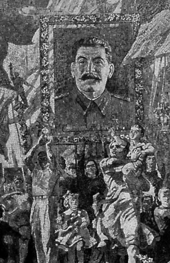 На одном из панно был изображён Сталин на параде 7 ноября 1941 года в Москве. Он стоит перед мавзолеем и держит знамя с изображением Ленина.