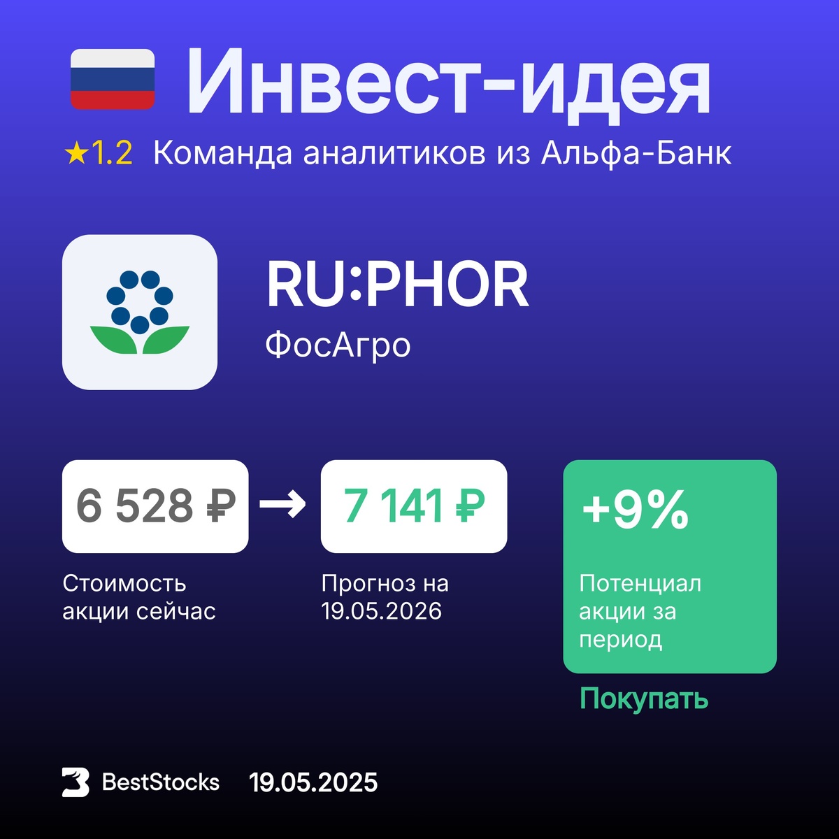 🇷🇺 Инвест-идеи по русским акциям Прогноз по акции ФосАгро Прогнозная цена: 7141 ₽ (+9%) Рекомендация: Покупать Дата прогноза: 19.05.2025 Прогноз до: 19.05.2026 Инвест-компания: Альфа-Банк Автор прогноза: Команда аналитиков Ещё рекомендации на сегодня → ••••• ❓ Брокер перестал показывать стоимость портфеля? Это можно исправить — BestStocks сделал специальный бесплатный инструмент, который показывает стоимость всех акций в вашем портфеле в реальном времени. Попробовать бесплатно