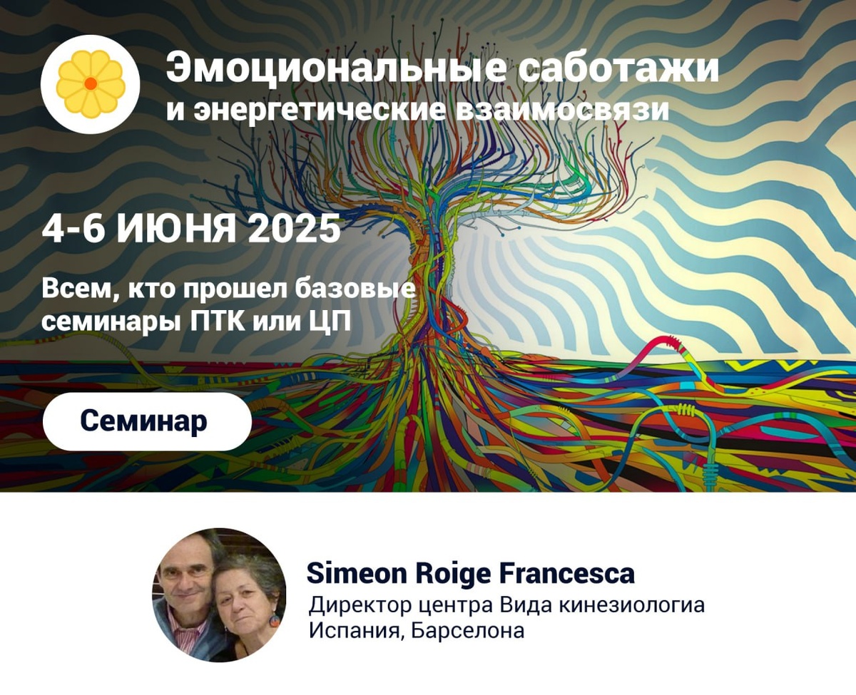 Дорогие друзья!🌿 Приглашаем на семинар "Эмоциональные саботажи и энергетические взаимосвязи", который будет проведен с 4 по 6 июня 2025 года Семинар проведёт автор Франческа Симеон - директор центра Вида кинезиологиа. Испания, Барселона ❗️Это редкая возможность послушать и поучиться у самого автора Мы затронем темы: 🔘 Саботажи и вторичные выгоды 🔘 Цвета конфликтов Люшера 🔘 Различные аффирмации для помощи 🔘 Цель жизни и конфликты 🔘 Межличностные энергетические взаимосвязи 🔘 Типология, оценка, уравновешивание, ресурсы для терапевта 🔘 Концепция и техника «энегетического заменителя» Подробнее о вебинаре можно узнать в личных сообщениях группы ВК или по ссылке — https://kinesioportal.ru/events/event15298.php