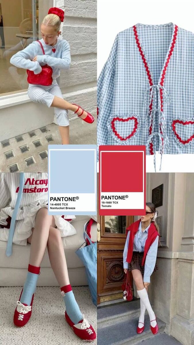 Одно из самых выразительных и гармоничных сочетаний — небесно-голубой и томатный красный. Нежность и мягкость первого оттенка создают ощущение чистоты и лёгкости, в то время как красный добавляет акцент, энергию и структуру образу. 🧵 Это сочетание хорошо работает в винтажной стилистике, вдохновлённой эстетикой ретро-униформ и кукольных силуэтов. Здесь важно соблюдать баланс: использовать красный как деталь — обувь, аксессуары, отделка. 🧺 Ткань в мелкую клетку, объёмные банты, белоснежные воротники и чулки усиливают визуальное впечатление — словно ожившая иллюстрация из японского журнала 90-х. Идеально для тех, кто не боится быть заметной, но умеет говорить о себе через детали. #тренды #мода #стиль