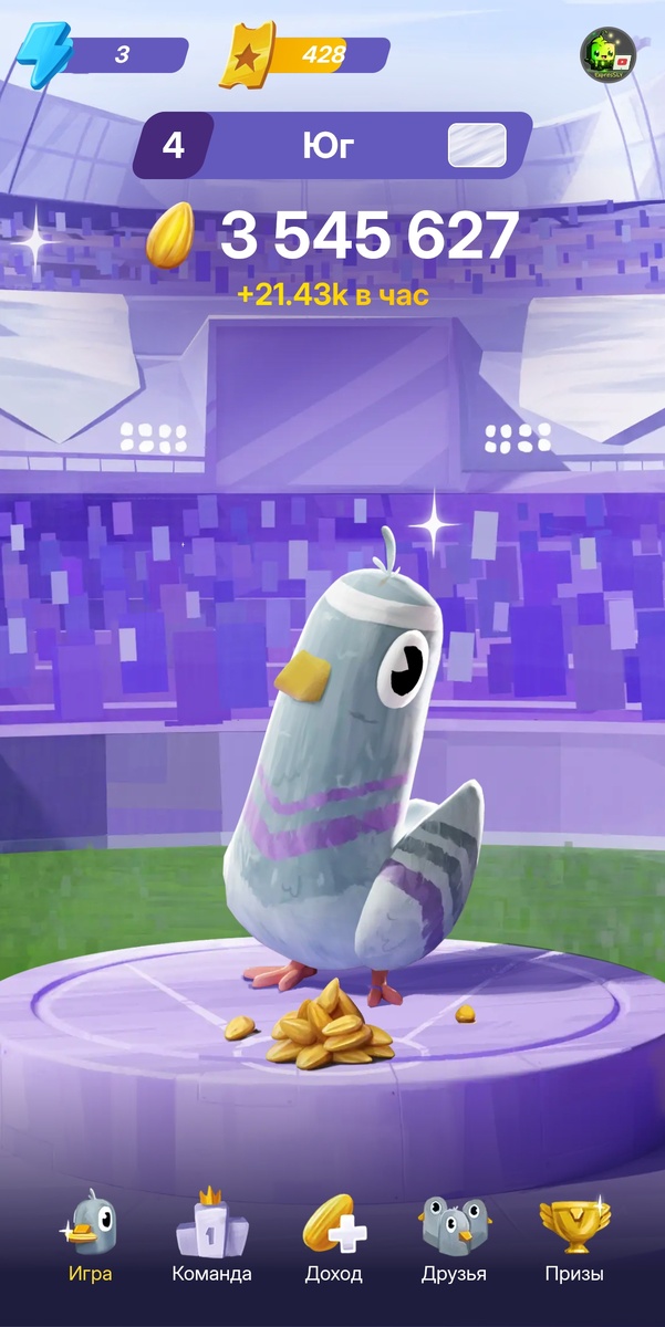 О подарках, которые можно получить тут, поговорим чуть ниже. Открываем приложение клюкер в телеграмме, тут нам предстоит играть за голубя Клюкера, который добывает семечки. В начале игры будет предложено выбрать команду, я рекомендую играть за "ЮГ"! Нажимая по экрану в игре, мы будем получать зёрна, на каждую добытую семку тратится 1 энегрия, которая восполняется по 3 единицы в секунду. Т.е. мы можем зарабатывать 180 семечек в минуту, 10800 в час или ~ 260к в сутки. Но, как и во всех подобных играх, наибольший результат приносит прокачка пассивного дохода. Я НЕ рекомендую вам прокачивать запас энергии или мультиклюк выше 5-7 уровня, они практически ни на что не влияют в сравнении с пассивным доходом. На соответствующей вкладке мы можем прокачивать различные улучшения для