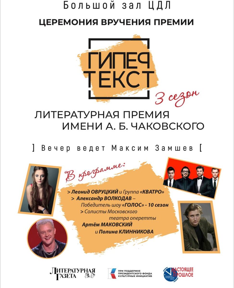 «Гвоздики» трепетно относятся к литературным премиям и обращают внимание на вручение премии «Гипертекст», которая уже третий год становится одной из ключевых точек культурного года. Названа она именем Александра Чаковского, автора романов «Победа» и «Блокада». По итогам предварительного отбора в работу экспертной комиссии вновь было принято свыше 3000 заявок. Помимо традиционных номинаций Премии от «Прозы» и «Поэзии» до «Слова молодым», будут награждены победите голосования «Выбор читателей». Кроме того, «За вклад в Литературный процесс» среди номинантов фигурирует Кристина Потупчик!