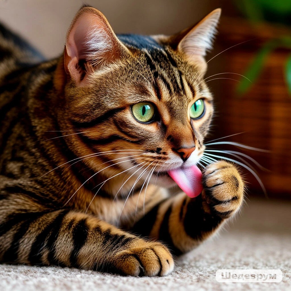 Кошка удаляет грязь, остатки пищи, посторонние запахи и отмершую шерсть. Её шершавый язык действует как щётка, помогая поддерживать чистоту.