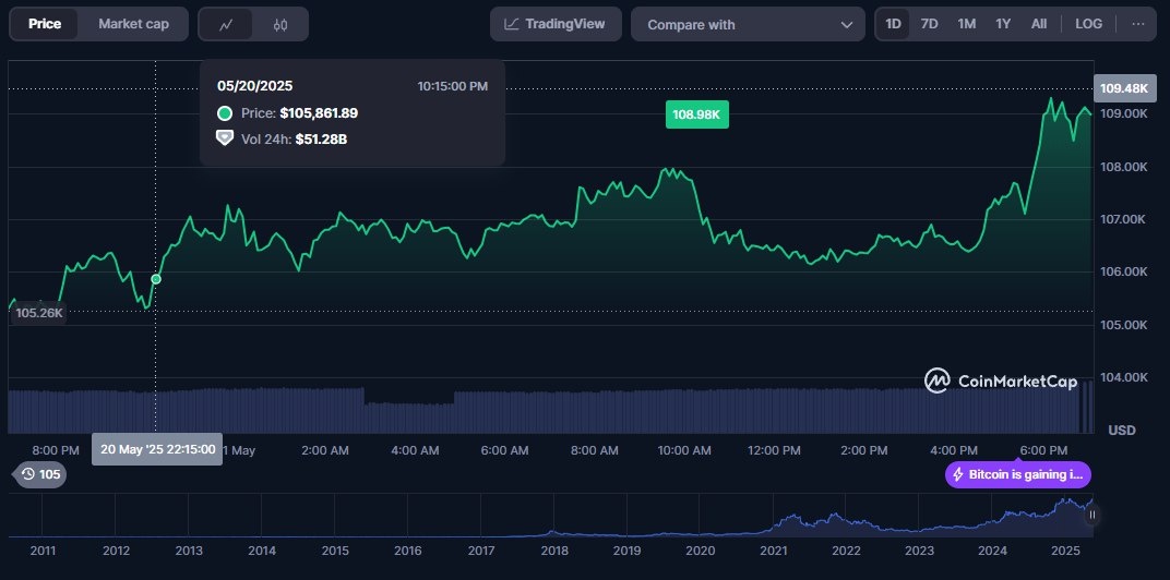 У биткоина новый рекорд — стоимость криптовалюты превысила $109,4 тысячи.