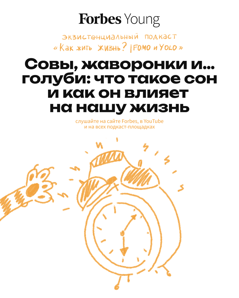 Почему сон – это не просто отдых, а жизненная необходимость? Чем опасен недосып? Нужны ли нам будильники? Передаются ли наши «сонные» привычки по наследству? Сон — это не просто отдых, а сложный процесс, который восстанавливает тело и психику. «Это состояние крайне важно для нашей жизни, потому что если мы лежим такие беспомощные, отключенные от внешнего мира… значит, что-то очень важное происходит в это время в организме и, скорее всего, прежде всего в голове, в центральной нервной системе», — объясняет эксперт выпуска, сомнолог, доцент кафедры нервных болезней и нейрохирургии Сеченовского университета, кандидат медицинских наук, президент Российского общества сомнологов Михаил Полуэктов. Как работают разные фазы сна? Правда ли, что «час сна до полуночи равен двум часам после»? Почему мы зеваем и «заражаем» других? Разбираемся в 13-м выпуске второго сезона экзистенциального подкаста «Как жить жизнь? | FOMO и YOLO». Слушайте прямо сейчас: • на сайте Forbes • в плеере Telegram