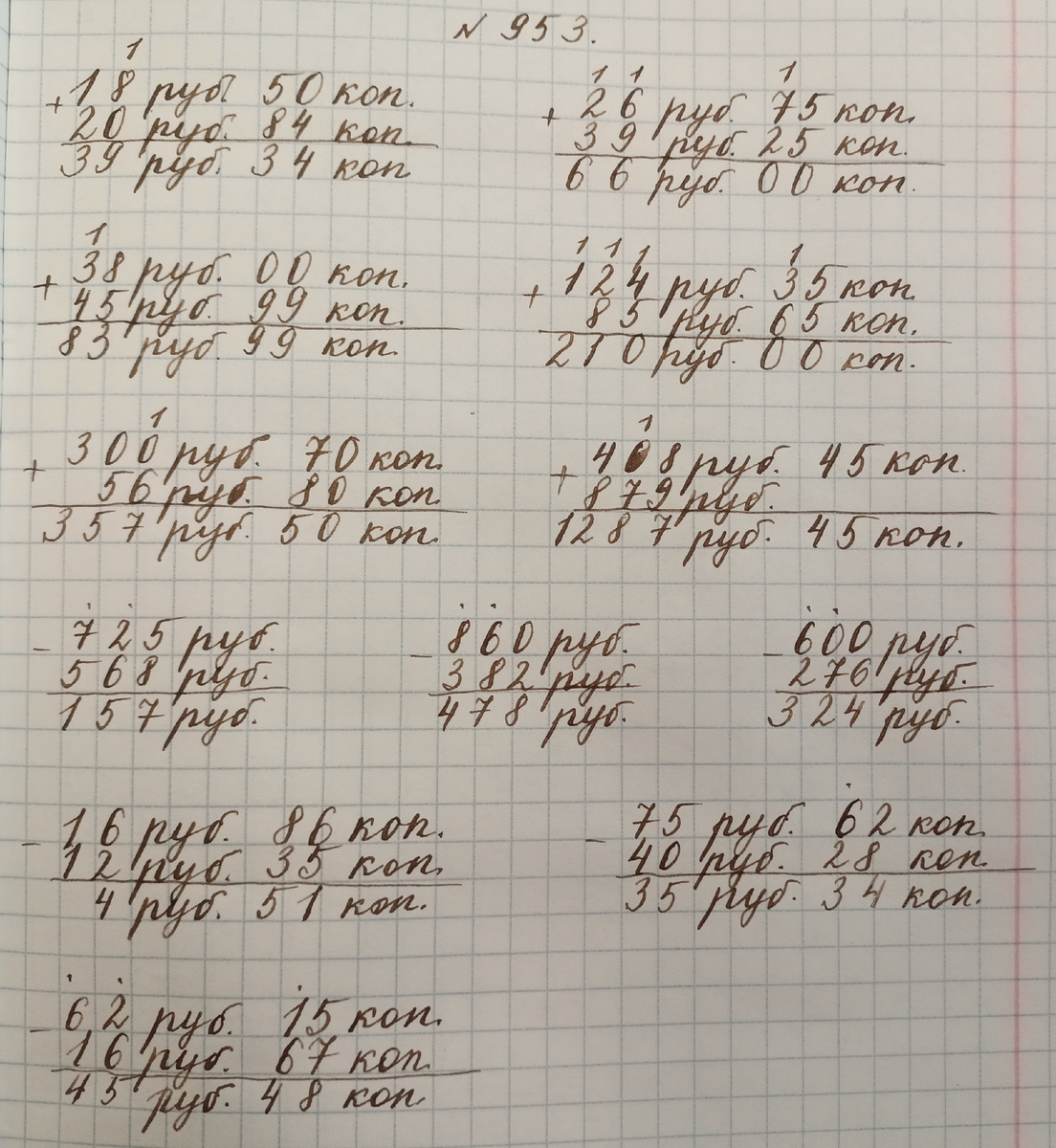 1. Проверка домашнего задания. 2. Объявление темы урока. Сегодня мы продолжим повторять пройденное за год. 3. Работа по теме урока. Начнём с повторения сложения и вычитания денежных единиц. Решим задачу 1037. Прочитайте. - Почему хозяйка смогла сэкономить деньги? (Она покупала овощи и фрукты на рынке). - Сколько она экономила на каждом килограмме лука? Моркови? Капусты? Яблок? - Сколько человек было в семье? - По сколько кг овощей и фруктов они съедают за год? - Что нужно узнать в задаче? Узнаем, сколько денег сэкономит хозяйка на 10 кг лука за год; на 9 кг моркови; на 41 кг капусты; на 52 кг яблок. Посчитаем, сколько всего денег будет сэкономлено. N 1082(1). Разгадаем числовые ребусы. Сначала запишем примеры с точками вместо чисел. Попробуем подобрать эти числа: 4*7* + 76*3 = 1*568. Начнем с единиц. - К какому числу можно прибавить 3, чтобы получилось 8? (5). - К какому числу можно прибавить 7, чтобы получилось 6? (9). Один десяток отправляется к сотням. - К какому числу можно прибав