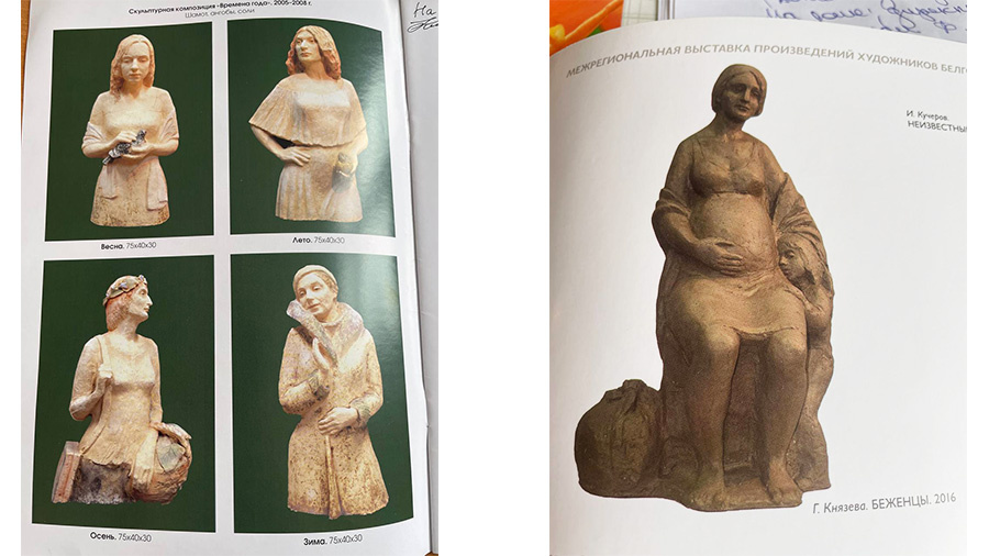 «Лучше работы здесь нет – она на выставке в Липецке. Это «Беженцы», да, те самые, с Украины, но, конечно, и все вообще, лишённые крова и с неясными жизненными перспективами…» – это Князева о своей скульптуре 2016 года выпуска.