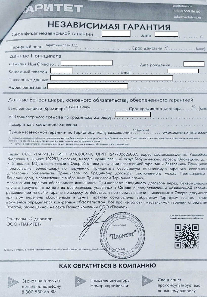 Услуга оформляется путем подписания Заявление о предоставлении независимой гарантии. Вместе с заявлением в пакете документов выдается Сертификат независимой гарантии.
