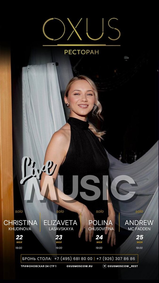 Объявляем обратный отчёт до лета!🏖️ Всего через 11 дней наступит долгожданный и любимый всеми сезон года.☀️ А вместе с ним летние новинки меню и живая музыка на веранде.🎤 На этой неделе приближают лето в OXUS: 22.05 | четверг | 19:00 | CHRISTINA KHUDINOVA | solo 23.05 | пятница | 19:00 | ELIZAVETA LASAVSKAYA | solo 24.05 | суббота | 19:00 | POLINA CHUSOVITINA | solo 25.05 | воскресенье | 19:00 | ANDREW MC FADDEN | solo Ресторан OXUS +7(495) 681 80 00 +7(926) 307 86 86 (WA/TG) Сайт, telegram