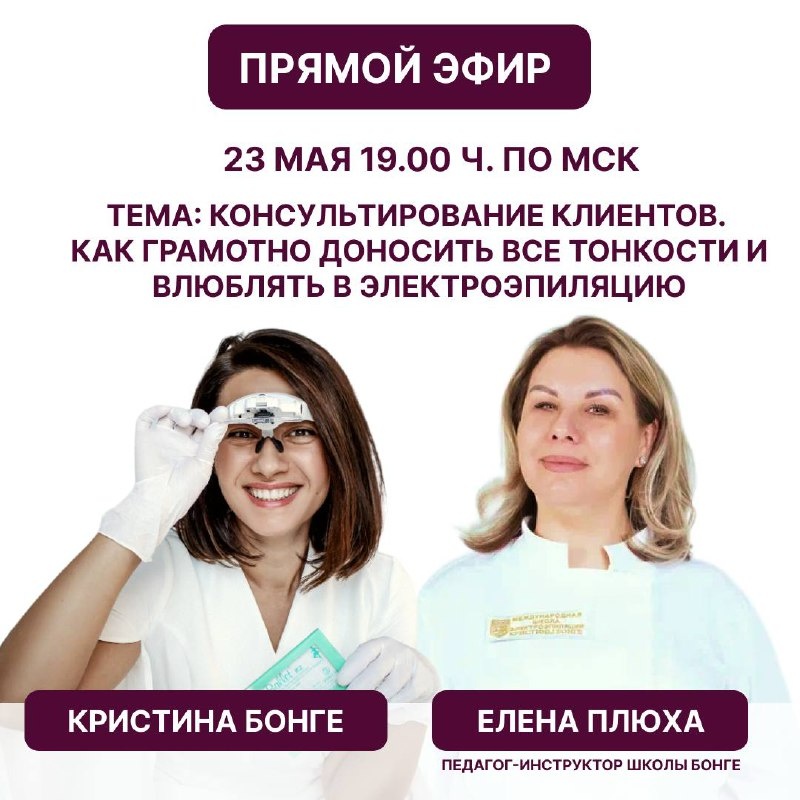 Марафон полезных эфиров продолжается ⚡ Ставьте себе напоминание 🔔 🗓 23 мая в 19.00 ч. по МСК проведем эфир: «Консультирование клиентов. Как грамотно доносить все тонкости и влюблять в электроэпиляцию» Спикер эфира: Елена Плюха, педагог-инструктор школы Бонге, г. Москва. Максимум пользы ждёт вас на этом эфире. Не пропустите ❤️🔥