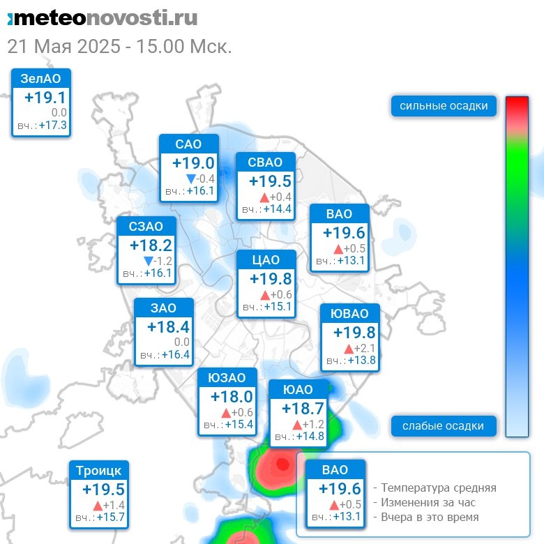 В 15:00 в Москве было от +17.1°C до +21.2°C, средняя температура +19.2°C #погода #Москва #весна #температура #21мая #среда