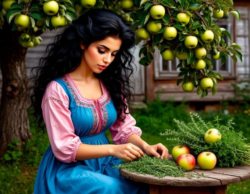 Близился полдень. Июльское солнце ласково обливало мир золотым светом. Аглая, укрывшись в прохладной тени двора, за столом, колдовала над травами, перебирая их и связывая в пучки.