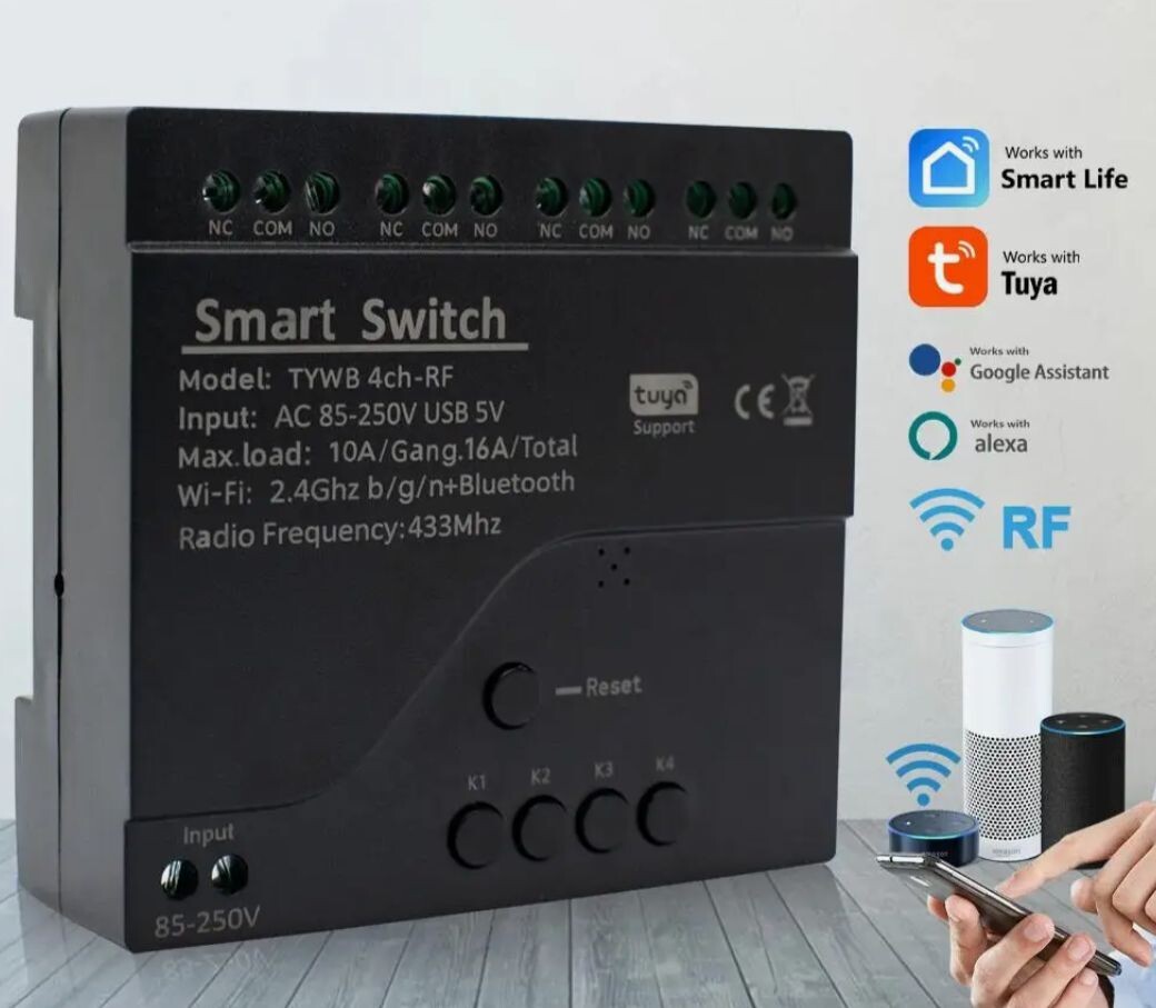 Выпускают уже лет 8. Последняя модификация 2024г. Размеры и характеристики реле. Ток через контакты 10А. Если нужно подключить мощную нагрузку смотрите статью про твердотельные контакторы. Внешний вид платы. Назначение разъемов и кнопок. В приложении видна как четыре отдельных выключателя. Для каждого можно настроить таймеры. Timing Function