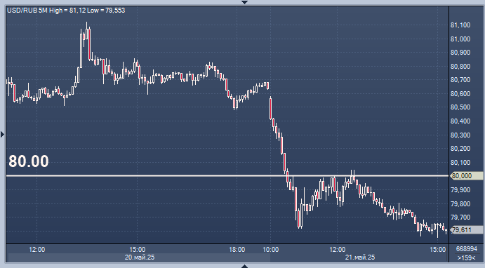 Рубль обновляет максимумы с июня 2023 года Курс доллара к рублю расчётный, фьючерс, вечный фьючерс и межбанк. Курс евро к рублю расчётный, фьючерс, вечный фьючерс и межбанк. Курс юаня к рублю биржевой, фьючерс, вечный фьючерс и межбанк. Российский рубль в среду укрепился за пределы уровня 80 за доллар США, достигнув тем самым самого высокого уровня с июня 2023 года. К 15:06 мск среды рубль вырос на 1,22% до 79,64 за доллар США, свидетельствуют данные LSEG, основанные на внебиржевых котировках. В этом году российская валюта подорожала к доллару более чем на 40%. Курс рубля, похоже, не испытал серьезного влияния новых санкций против России, объявленных ЕС и Великобритания 20 мая, которые направлены против «теневого флота» российских нефтяных танкеров и финансовых компаний. Аналитики отмечают, что укрепление рубля в этом году связано с ослаблением геополитической напряженности и жесткой денежно-кредитной политикой центрального банка, которая снизила спрос на иностранную валюту. «Укреплени