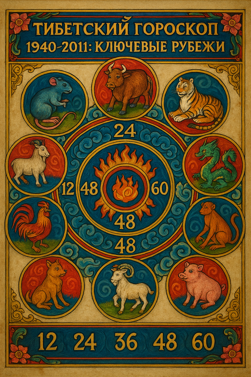Тибетский гороскоп, или «колесо жизни», уходит корнями в глубокую древность тибетских монастырей и синтезирует в себе два цикла — 12 животных и пять стихий (дерево, огонь, земля, металл, вода). В текстах Ньингма и Кагью он использовался не только для выбора благоприятных дат (свадьбы, строительства, религиозных обрядов), но и для понимания ритмов человеческой жизни. В системе выделяют пять ключевых возрастных вех — 12, 24, 36, 48 и 60 лет — которые соответствуют этапам взросления, поиска призвания, личного кризиса, закрепления опыта и завершения полного 60-летнего цикла, отдающего дань космическому круговороту. Для тех, кто родился с 1940 по 2011 год, каждый рубеж накладывается на символ одного из двенадцати знаков — от Дракона до Кролика, создавая индивидуальную карту жизненных вех. Осознанная работа с этими точками опоры через медитации, дыхательные практики и обряды тибетской традиции помогает встретить перемены во всеоружии и гармонично пройти каждый этап. Тибетский гороскоп, подо
