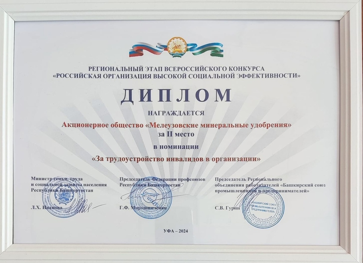 20 мая в Доме Правительства Башкирии состоялась церемония награждения победителей и призёров регионального этапа Всероссийского конкурса «Российская организация высокой социальной эффективности». Конкурс проводился в 15-й раз, и за этот период стал всё более узнаваемым и популярным среди предприятий Башкирии. В 2024 году в нём приняли участие 30 организаций республики. В их числе - АО "Мелеузовские минеральные удобрения". На церемонии награждения предприятие представляла заместитель генерального директора по персоналу и социальным вопросам Лариса Михайловна Серпкова. АО «Мелеузовские минеральные удобрения» было представлено в номинации «За трудоустройство инвалидов в организации». По итогам конкурса предприятие удостоено второго места! Вручал диплом заместитель Премьер-министра Правительства Башкирии - министр спорта Руслан Тагирович Хабибов. Призовое место в конкурсе означает, что АО "Мелеузовские минеральные удобрения" неизменно следует принципам социальной ответственности в своей ра