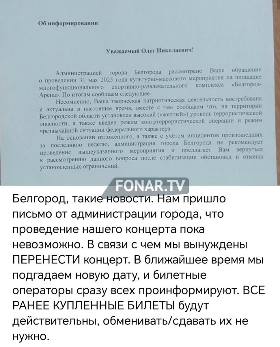 ⚡️Группа Radio Tapok объявила о переносе концерта в Белгороде, потому что получила письмо из администрации Белгорода