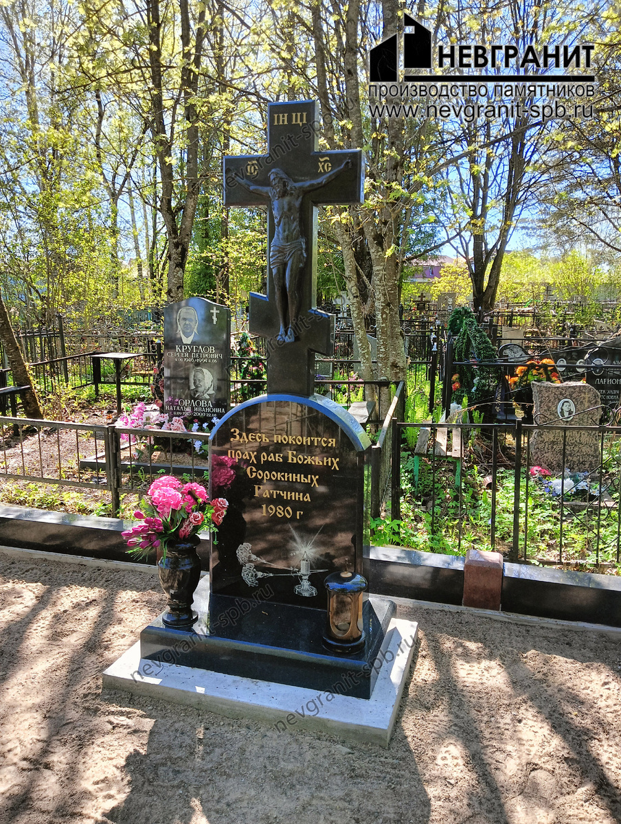 На фотографии предстает монументальный памятник, пропитанный духом истории и глубокой веры. Это не просто надгробие, а символ связи времен, отражение памяти о предках и их духовном наследии. В центре композиции – строгий и величественный православный крест, выполненный из черного гранита. Распятие Христа, искусно вырезанное на кресте, напоминает о вечных ценностях и искуплении. Под крестом расположена гранитная стела, на которой выгравирована надпись старославянским шрифтом. Эти слова, словно эхо прошлого, рассказывают о тех, кто покоится в этой земле. Особую атмосферу создает контраст между черным гранитом стелы и светлым основанием. Это подчеркивает величие памятника и придает ему особую торжественность. Ухоженное место захоронения, аккуратно отсыпанное песком, свидетельствует о заботе и уважении потомков. Яркий акцент – пышный букет розовых цветов, символизирующий вечную любовь и светлую память. Этот памятник – не просто надгробие, а живая история, запечатленная в камне. Он напом