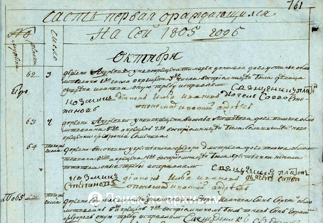 62. жен. 3 числа. Деревни Андреевки у новокрещена Тимофея Андреева дочь Устинья, обмолитвована 1, а крещена 3 числа, восприемницей была девица Огрофена Иванова.
