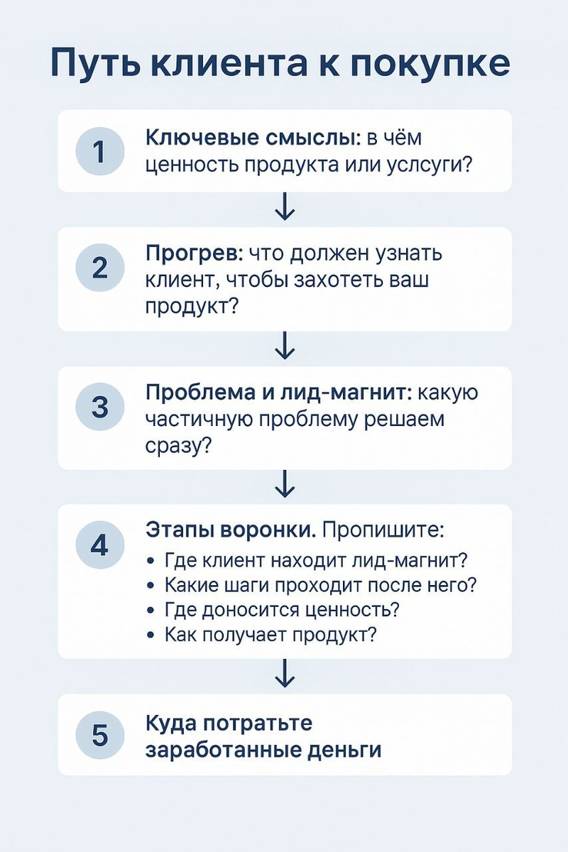 Хотите ✖️3 В ПРОДАЖАХ уже сейчас❓ Вот мини-практика, которую я даю своим клиентам на старте, чтобы быстро диагностировать слабые места и кратно усилить воронку продаж. Сделайте прямо сейчас: возьмите лист и пропишите путь клиента от первого касания с вами до оплаты. Вот как его составить: 1️⃣ Начните с сути: запишите главную ценность вашего продукта/услуги. Не что это, а для чего это нужно клиенту. Не «10 уроков», а трансформация. Не «консультация», а «спокойствие, уверенность, ясность». Напишите ценность словами клиента. 2️⃣ Теперь — прогрев. Какие шаги должен пройти клиент, чтобы осознать, что ваше предложение — лучшее решение? Подумайте как эксперт: что нужно показать, рассказать, раскрыть? 3️⃣ Создайте лид-магнит. Какую одну, ключевую проблему вы можете частично помочь решить прямо сейчас, чтобы клиент захотел большего? И в каком формате — видео, тест, статья, мини-гайд? 4️⃣ Распишите воронку пошагово: — Где человек увидит ваш лид-магнит? — Как он попадёт в прогрев? — В како