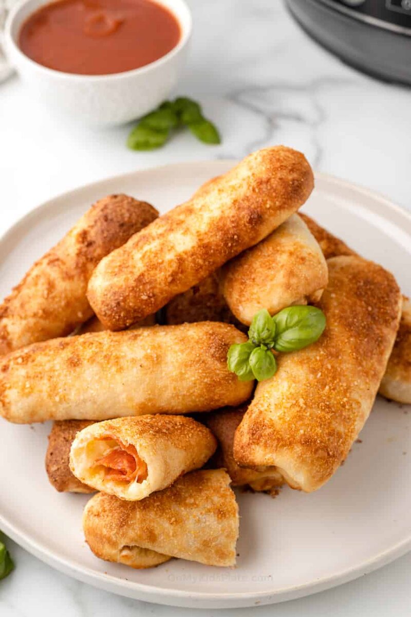 Калории: 198 ккал | Углеводы: 21 г | Белки: 7 г | Жиры: 9 г | 1. Растяните тесто для пиццы в большой прямоугольник. Разрежьте тесто на девять равных прямоугольных частей. Если вы используете покупное или замороженное тесто для пиццы, дайте ему постоять при комнатной температуре не менее 20-30 минут, прежде чем пытаться раскатать его. Холодное тесто для не так легко растягивается и его будет трудно раскатать в лист. 2. Положите столовую ложку сыра в центр каждого куска теста. Сверху положите четыре ломтика пепперони. Вы также можете добавить немного любимой приправы, например, итальянские травы. 3. Плотно сверните тесто в рулет. Защипните концы теста пальцами, чтобы они закрылись и хорошо запечатались. 4. В небольшой миске смешайте растопленное масло, чеснок и соль. 5. Разогрейте духовку до 200 градусов. Переложите все роллы на противень, предварительно постелив пергаментную бумагу. Положите рулетики так, чтобы они не соприкасались. 6. Смажьте верх булочки маслом. 7. Выпекайте булочки