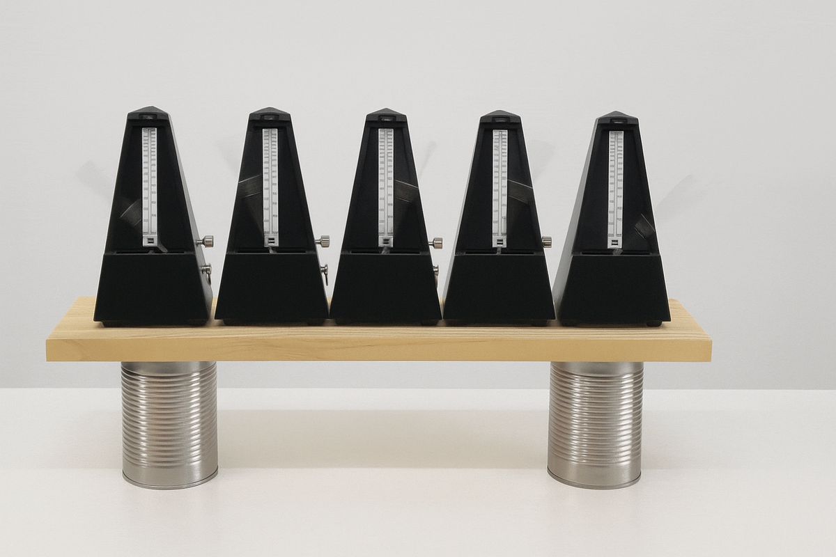 Это интересный и довольно наглядный физический феномен! Метрономы действительно могут синхронизироваться при определённых условиях — и всё дело в передаче колебаний через общую основу. Вот почему это происходит: Когда ты ставишь несколько метрономов, заведённых с разной фазой (т.е. они не в унисон), на подвижную платформу (например, лёгкую доску, лежащую на банках или цилиндрах), каждый из них при раскачивании создаёт маленькие импульсы, передающиеся через платформу. Эти импульсы немного смещают основание, и в итоге все метрономы начинают взаимодействовать друг с другом механически. Со временем они, образно говоря, "договариваются" друг с другом — происходит согласование фаз. В итоге все метрономы начинают тикать в унисон — это и есть синхронизация.